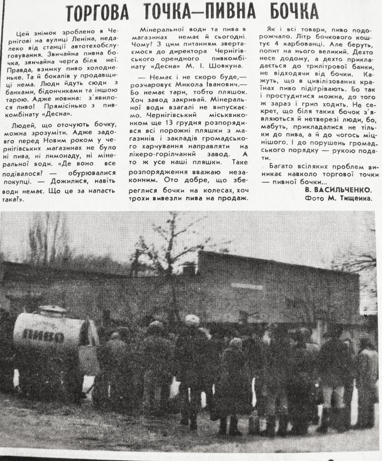 В то время, как черниговские дети стояли в очередях за «экзотическим» мороженым, взрослые стояли в очередях за бочковым пивом, так как бутылочного пива в магазинах, также как и лимонада и минеральной воды, найти было невозможно. Вся причина была в том, что горисполком постановил: всю пустую тару из магазинов и заведений общепита направлять исключительно на потребности ликеро-водочного завода. Вот такая она была рыночная экономика 92-го года, с ручным управлением и с коррупционной составляющей.