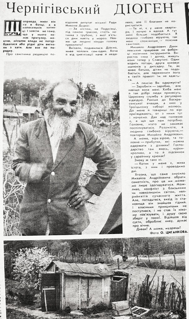 Ну, раз уж заговорили о бочке, то тут следует упомянуть и о «черниговском Диогене», который правда жил не в бочке, а в сколоченной из подручных средств лачуге, которая стояла недалеко от объездной трассы, на Подусовке. Жил в ней Михаил Андреевич Данилевский, который не был бездомным и не был одиноким человеком – у него была квартира и были дети: сын – был машинистом, дочь – воспитателем в детском саду. А в этой лачуге, по его словам, он искал, будучи глубоковерующим человеком, спокойствия и умиротворения, даже отказался от пенсии и довольствовался тем, что вырастит на маленьком участке возле своей «кельи» и тем, чем поделятся с ним добрые люди.