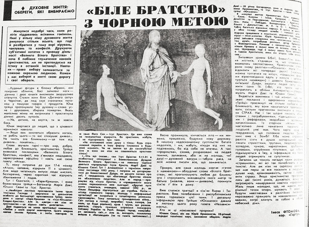 Но совсем другая ситуация была с религиозным течением, основатели которого Юоани Свами (Юрий Кривоногов) и Мария Деви Христос (Марина Мамонова (Цвигун)) смешав тексты Библии и Бхагавад-Гиты, объявили в 1991 году об основании религиозной организации «ЮСМАЛОС», больше известной, как «Белое братство». Представителей этого религиозного течения в 92-ом можно было часто встретить в оживленных местах и на многолюдных улицах Чернигова. Зачастую ониотпугивали большинство людей, так как из их уст можно было часто услышать о «конце света», о «господстве сатаны» и прочих страшных и неприятных вещах. Адепты «братства», как выясниться позже были психологически «обработаны» своим лидером – специалистом в области психического воздействия на людей, а заполонив улицы украинских городов, проповедовали свою, малопонятную широкому кругу людей, религию и отовсюду вещали о «конце света», который, по словам «духовных наставников» секты должен был произойти 24 ноября 1993 года.