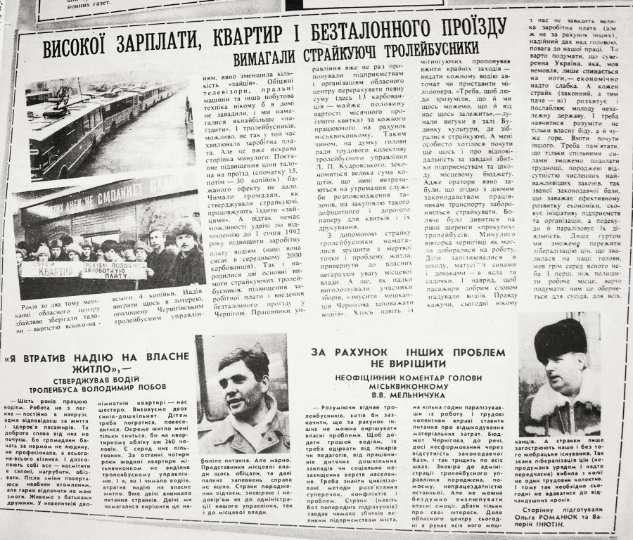Но куда там «белому братству» - вот черниговские троллейбусники в один из февральских дней устроили для многих жителей города, настоящий локальный «конец света», не выйдя в тот день с утра на линию. В детские садики, школы, на работу люди в большинстве добирались пешком. Крупным промышленным предприятиям, которые в 92-ом году работали и выпускали продукцию, были нанесены большие убытки. Троллейбусники же требовали в первую очередь поднятия зарплат и решения своих жилищных проблем. Ситуацию, при помощи главы горисполкома, удалось разрешить только к вечеру, а еще позже прокуратура, через суд, признает эту забастовку работников ЧТУ – незаконной.