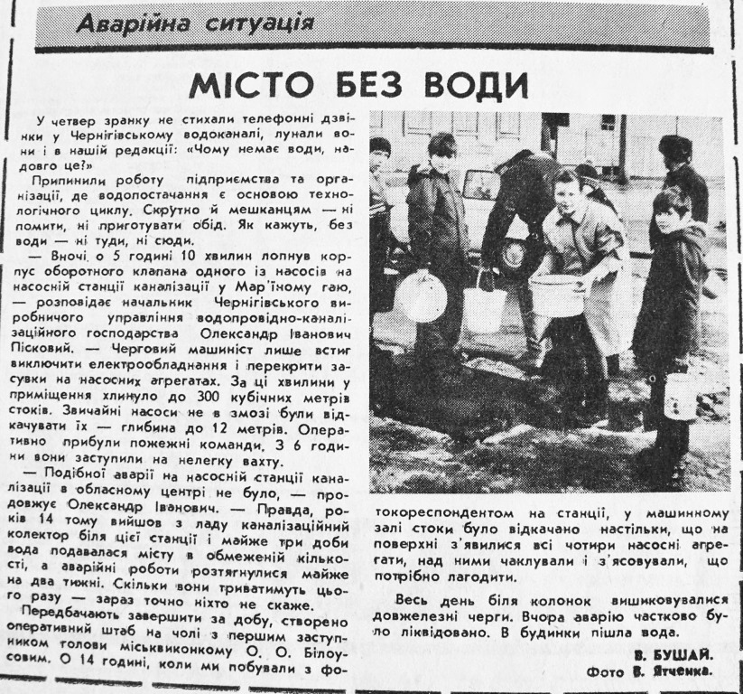 Тогда же, в феврале, а именно 27 числа, многие предприятия снова остановились, и абсолютно все жители города Чернигова не смогли утром умыться водой из-под крана и приготовить утренний кофе, если в чайнике не осталось с вечера воды. Дело в том, что в 5 часов утра произошла авария на насосной станции «Черниговводоканала», которая была расположена в Марьином Гаю. Последствия аварии были ликвидированы довольно оперативно, хотя в многоэтажки, выше третьего этажа вода поднялась только 2 марта.
