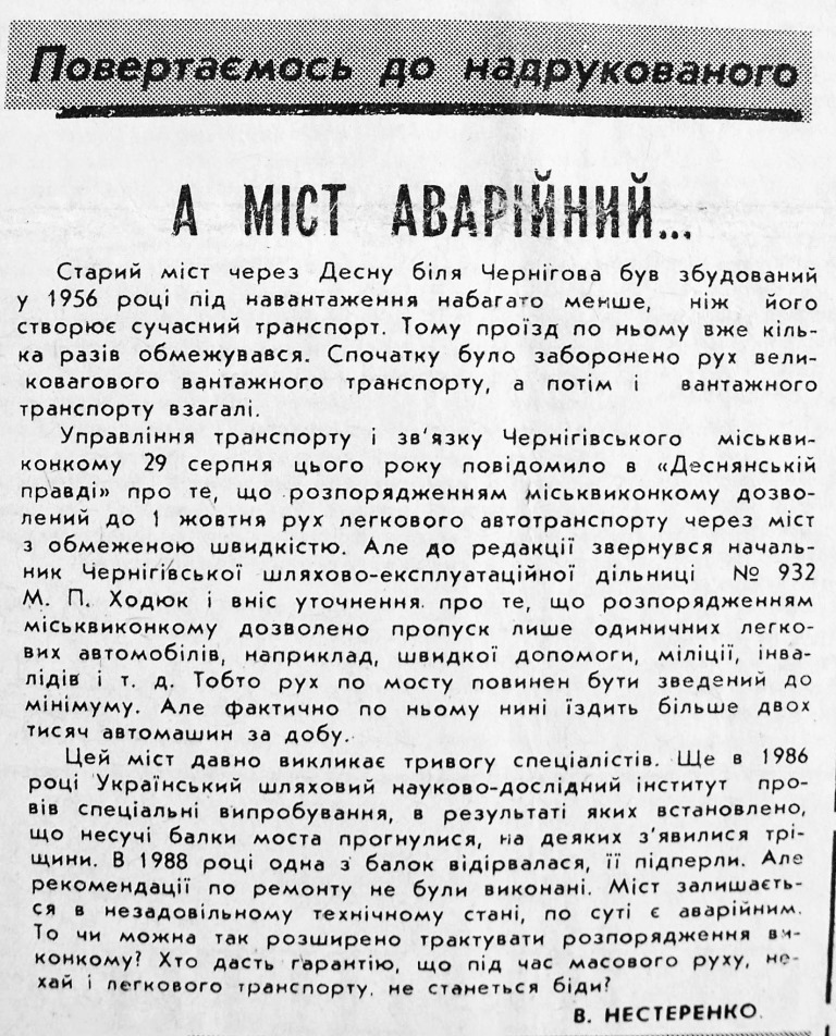 Навлекали беду и те автолюбители, которые ездили по мосту через Десну по Киевскому шоссе. В конце лета горисполком выдал распоряжение, согласно которому движение по мосту разрешалось только спец автомобилям и одиночным легковым автомобилям с минимальной скоростью движения. Но никто из автомобилистов не хотел делать большой крюк по объездной дороге и каждый день две тысячи автомобилистов рисковали своей жизнью, проезжая по аварийному мосту, у которого одна из балок оторвалась еще в 1988 году.