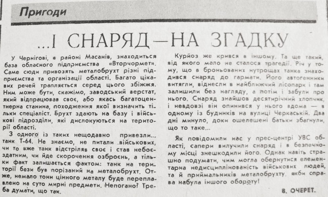 Танки в 1992 году, без соблюдения каких-либо формальных процедур, сдавали просто на базу «Вторчермета», где его разрезали на металлолом, который в свою очередь, шел на изготовления мирной продукции. В одном из таких случаев, халатность военных и халатность работников металлобазы, чуть не обернулись трагедией. Первые забыли снаряд в танке, а вторые забыли его в соседнем лесу, когда разрезали танк на части и таким образом, снаряд оказалась дома у 10-летнего ребенка, который только по счастливой случайности, не решил изучить более детально свою опасную находку.