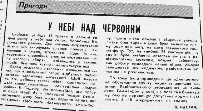 Спустя год, после трагедии, в которой погиб черниговский курсант Роман Еськов, в небе Чернигововской области снова произошла авиакатострофа, в которой, к счастью, из людей никто не пострадал. Но вот капсула с радиоактивным изотопом, выпавшая из разбитого самолета, которая обеспечивала работу одного из приборов, чуть не стала причиной массовой паники жителей села Красного, что в Коропском районе области.