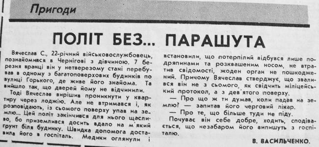 Ни один день не обходился без краж, грабежей, разбойных нападений и убийств. Самой употребительной фразой в 92-ом на тихих и темных улицах и в неосвещенных подъездах Чернигова была фраза «кошелек или жизнь». Но грабителей интересовали не только кошельки. К примеру, в газете «Черниговские ведомости» целая колонка под заголовком «Берегите шапки!» содержала советы для жителей города как не стать жертвой «охотников» за мехами и драгоценностями. Вот один из них, адресованный прекрасной половине населения города: «Не стоит подозревать всех окружающих, но если на вас дубленка, шуба из натурального меха, ценная шапка, дорогие украшения, то попробуйте в троллейбусе обвести окружающих взглядом, чтобы знать в каком окружении вы едете. Не проявляют ли к вам внимание. Возможно на вас смотрят как на привлекательную женщину – читайте это по глазам (!). Если вы увидели, что к вам проявляют интерес, попробуйте убедиться в этом: выйдите с троллейбуса, а потом зайдите или переместитесь в салоне, чтобы оценить реакцию на ваши действия…» Ну а далее прилагалась целая инструкция, как действовать в ситуации, если человек все-таки стал жертвой грабителей, в погоне за которым, милиция, согласно закону, могла применить табельное оружие, но только в случае, если стоимость украденого составляет более 300 купоно-рублей. В данном случае интересно, как работник в милиции мог определить стоимость украденной вещи в погоне за преступником?