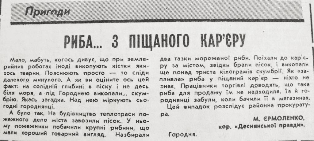 Еще один курьезный, а точнее обескураживающий случай, произошел в Городне, где из карьера, откуда брали песок для коммунальных нужд, выкопали более 300 килограмм мороженой скумбрии. Не ископаемой, а даже имеющей хороший товарный вид. Газета с этой заметкойне была датирована 1 апреля и расследованием загадочного случая занималась районная прокуратура.
