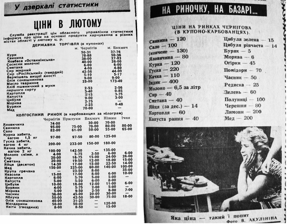 Журналист «Деснянской правды» отправился в экскурсию по рынкам и магазинам Чернигова в первый день введения в обращение купонов. Моментального «чуда» новая денежная единица не принесла – прилавки черниговских магазинов оставались, как и раньше пустыми, а люди по-прежнему стояли в длинных очередях. Среди продавцов на рынке была некоторая растерянность: никто не знал, в какой «валюте» выгоднее продавать свой товар и поэтому в основном половину стоимости брали еще в рублях, а половину в купонах.