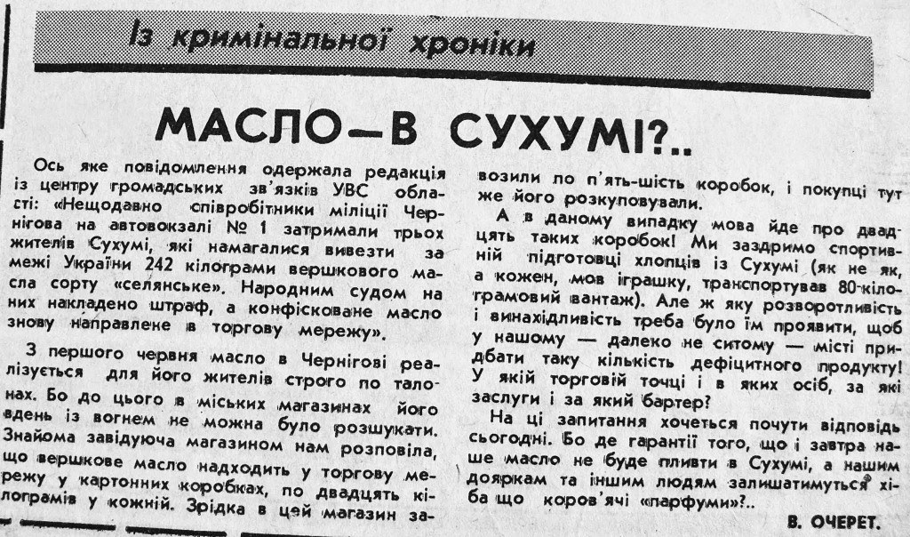 Учитывая то, что информация о возможном поднятии цен на масло, в виде слухов, появилась до его фактического подорожания, некоторые «делки», а в приведенном случае трое жителей Сухуми, пытались вывезти из Чернигова 240 кг (!) дефицитного продукта. Журналист не без доли иронии позавидовал спортивной форме грузинских парней, так как каждый из них транспортировал по 80 килограмм ценного продукта.