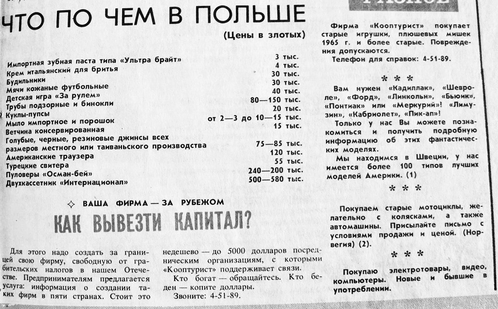 Но интересно куда смотрели правоохранительные и фискальные органы, когда в информационно-рекламном приложении к газете «Черниговский вестник», которое выпускал кооператив «Кооптурист», рядом с объявлениями сомнительного характера распологалось деловое предложение фирмы под заголовком «Как вывезти капитал?», где кооперативщики открытым текстом предлагали избежать грабительских налогов нашего Отечества, открыв фирму за рубежом. Свои посреднические услуги, по выведению капитала, «Кооптурист» оценивал недешево, в 5 тысяч долларов. Возможно это было объявление было фикцией, но то что капиталы выводились и продолжают выводиться за границу, в оффшоры, на протяжении всей истории независимой Украины - это факт.