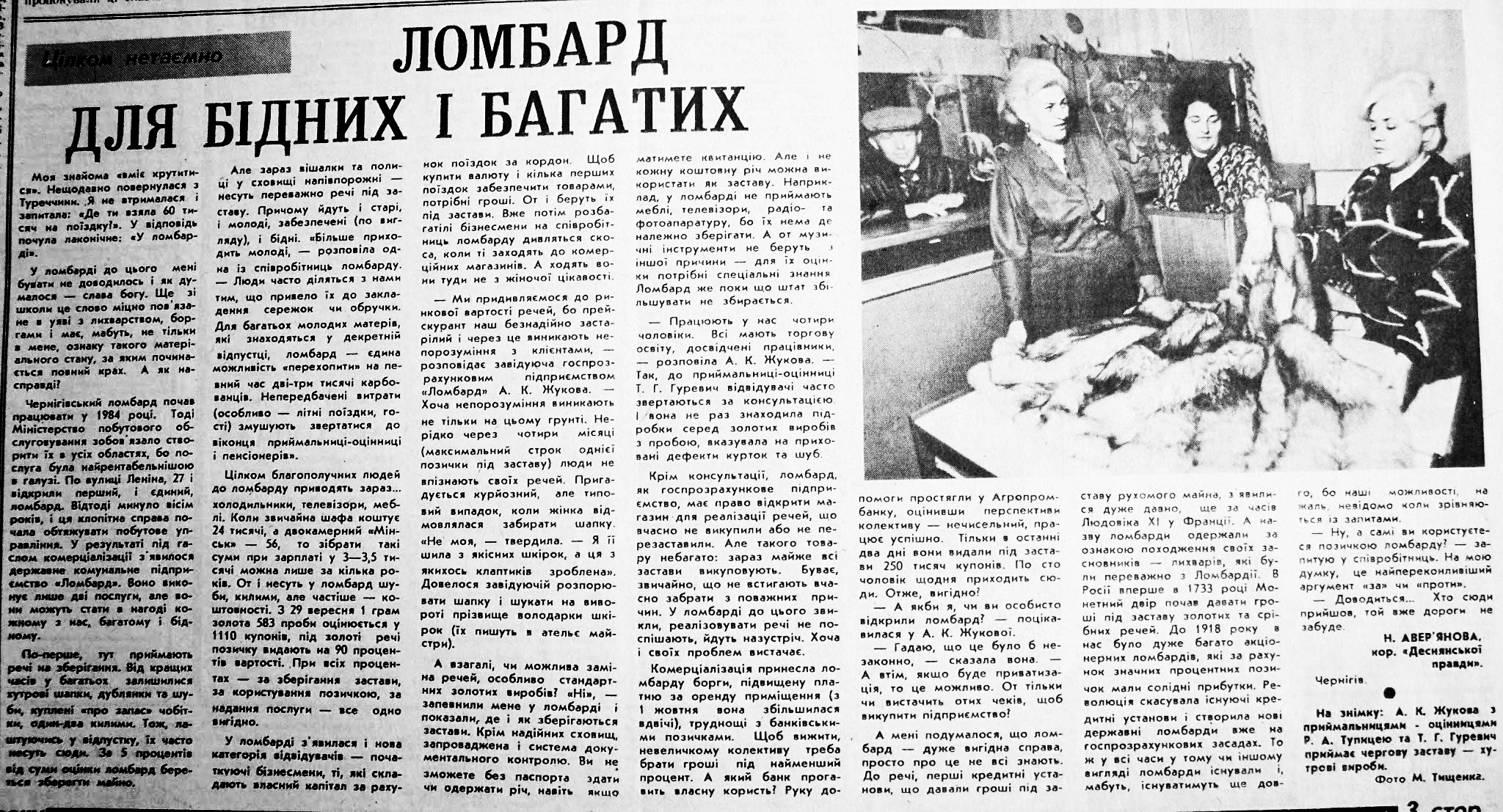 Но многим для того, чтобы заняться коммерцией нужен был стартовый капитал. Поэтому особую популярность на рынке, если его таковым можно назвать, финансовых услуг завовевал ломбард. Хотя он и существовал в Чернигове с 1984 года – до 92-го его услугами пользовались не так массово, как после обретения страною независимости. Сдать в ломбард можно было все-что угодно, кроме телевизоров, мебели, радио и фототоваров для хранения которых не было соответствующих условий, а вот шубы, меха и конечно же золото люди несли в ломбард нескончаемым потоком. Это было связано и с тем, что потребительского кредитования как такого в стране не было и люди с зарплатой в 3-4 тысячи не могли сразу приобрести в дом, к примеру, двухкамерный холодильник стоимостью более 50 тысяч, для этого и обращались в данное учреждение.