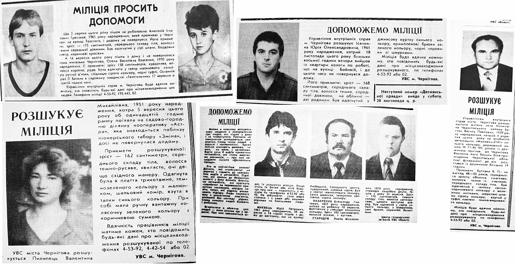 Необходимо заметить, что массовым явлением в начале 90-х годов стало исчезновение людей. В 1992-ом, в черниговских газетах с регулярным постоянством размещались фотографии и ориентировки, относительно пропавших без вести, среди которых можно было встретить людей разного возраста, пола и социального статуса. В начале года в официально пропавшими числилось 546 человек. К концу года их количество уменьшилось до 128, но не потому, что всех находили живыми и невредимыми.