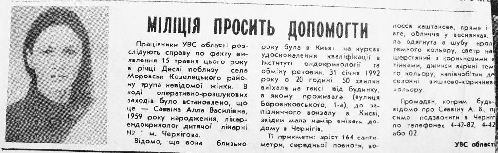 В другом жутком случае личность «утопленника» была установлена – это была 33-летний врач-эндокринолог первой детской больницы Алла Саввина. Последний раз ее видели 31 января 1992 года в Киеве, откуда она, пройдя курсы повышения квалификации, собиралась ехать обратно в Чернигов. Села в такси, которое должно было ее отвезти на ж/д вокзал, но домой в Чернигов, она так и не попала. Лишь спустя 4,5 месяца ее тело выявили и достали из Десны, около села Моровск Козелецкого района.