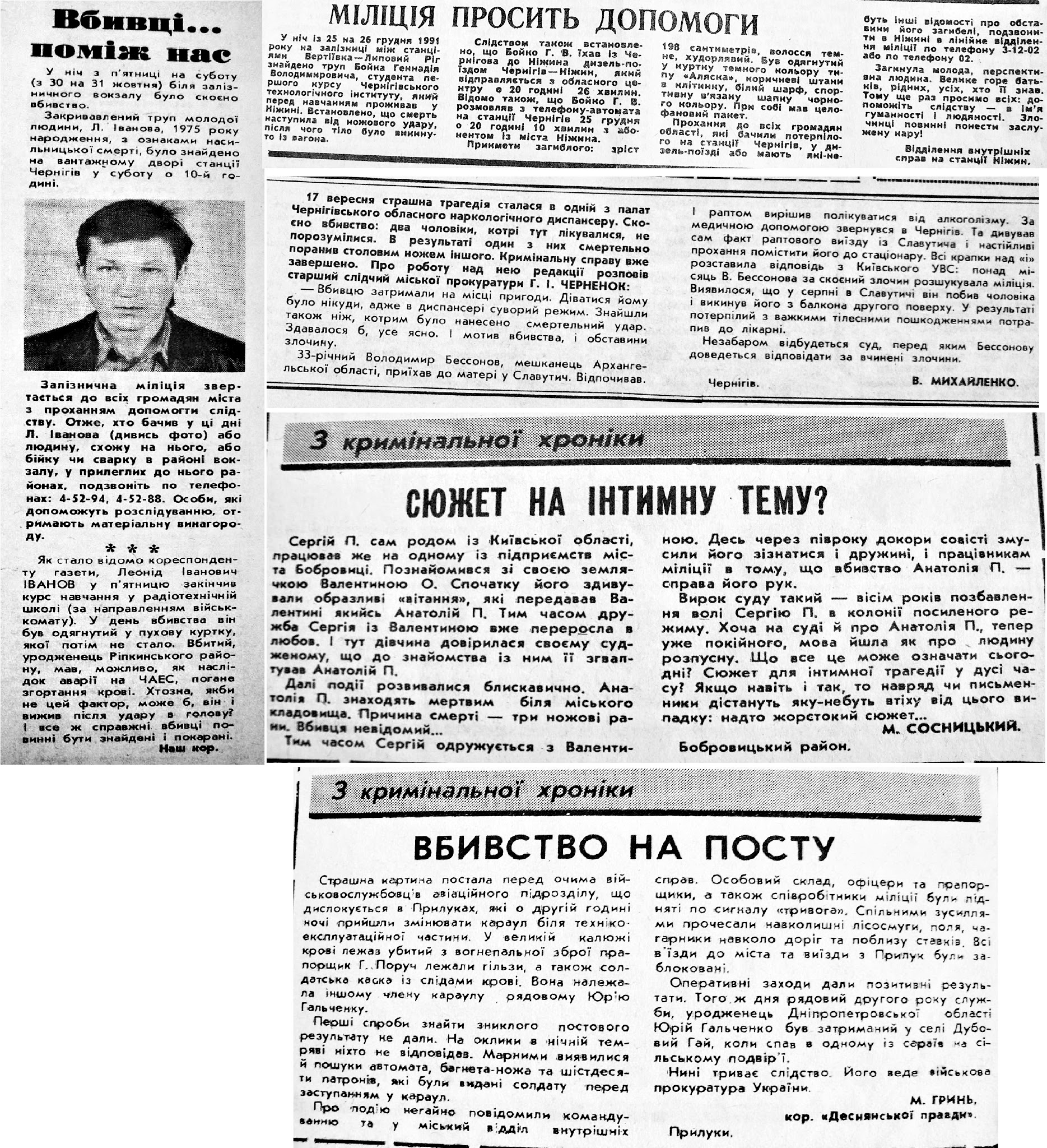 В конце 1992 года «Черниговские ведомости» в большой статье подвели неутешительные итоги уходящего года. Согласно официальной статистике УВД, в 1992 году было совершено 44 убийства. Зачастую жертвами страшных преступлений становились родственники или близкие убийц: в одном из таких ужасных случаев собственный отец в пьяном угаре заколол «швайкой» собственную дочь, а один из преподавателей черниговского ПТУ, также злоупотреблявший алкоголем, задушил собственную жену, после чего попытался инсценировать ее самоубийство.