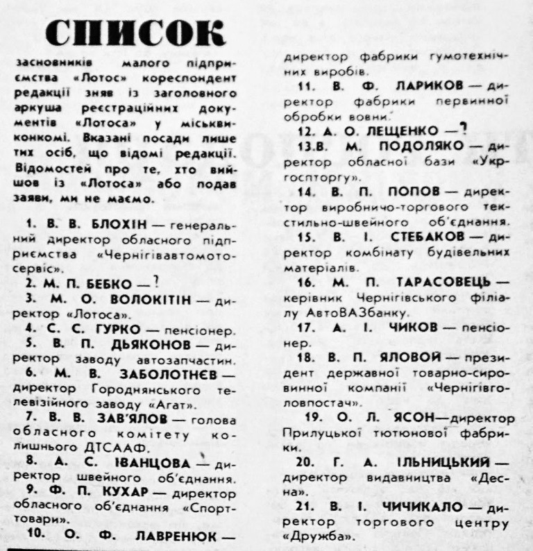 А вот фирма «Лотос» подошла к своему ремеслу основательно. 16 декабря 1991 года, без особых проволочек и бюрократии, Черниговским горисполкомом была зарегистрировано данное малое предприятие с ограниченной ответственностью. Достаточно взглянуть на список учредителей этого предприятия, дабы понять, что тут собрался настоящий клуб черниговских миллионеров, многие из которых со временем «приберут к рукам», с помощью слова «приватизация», немало государственного и коммунального имущество на территории города. Не смотрите на то, что в составе учредителей числится два пенсионера,- чиновники еще на заре независимости поняли как надо вести свои дела; один из них С. Гурко – это тесть главы горсовета Валентина Мельничука, который в 1992-ом стал губернатором, а А. Чиков – это отец директора фирмы «Черниговсервис».