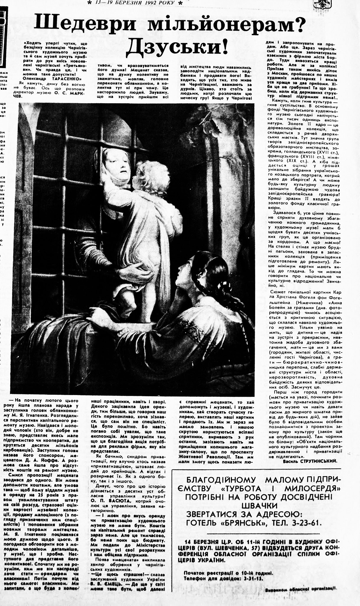 Ну и в завершении неутешительного обзора криминальной хроники 92-го года, хотелось бы обратить внимание на один случай, в котором на первый взгляд ничего криминального нет. Но мало кто из жителей города знал (и я в том числе), что с подачи одного из заместителей главы областного исполкома – некого М.Я. Игнатенко, Чернигов мог лишиться если не самого художественного музея, то своих экспонатов – запросто. Все началось с того, что в начале февраля 1992 годапрошло заседание областного исполкома, где рассматривался вопрос о капитальном ремонте художественного музея. На этом заседании присутствовал молодой человек, которого вышеупомянутый М. Игнатенко представил директору художественного музея О. Маркчеву, как мецената и спонсора, который представляет одну из черниговских фирм с многомиллионным оборотом.
