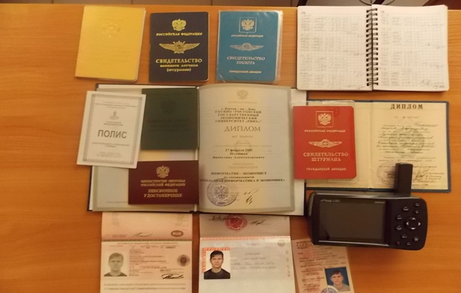 Отностительно этого гражданина было принято решение о проведении контроля второй линии и углубленного досмотра его личных вещей. При проведении, совместно с сотрудниками таможни, этой проверки, при осмотре чемодана пассажира обнаружено целую пачку документов Российской Федерации, а именно: Свидетельство пилота, Военный билет офицера запаса ВС, Свидетельство диспетчера управления воздушным движением, Свидетельство военного летчика (штурмана), Свидетельство штурмана гражданской авиации, пенсионное удостоверение, Диплом об окончании Луганского высшего военного авиационного училища штурманов, Страховой медицинский полис и другие. Кроме того, он имел при себе еще и GPS - навигатор GARMIN.