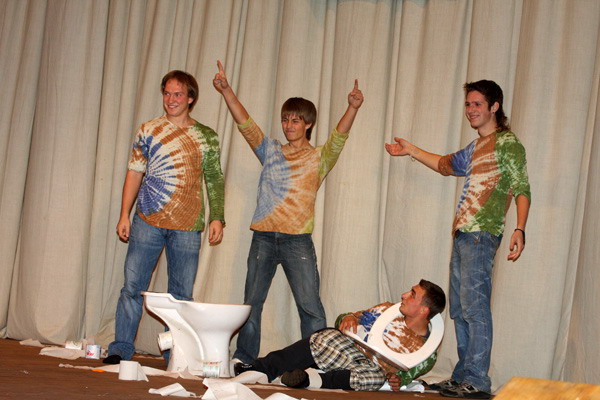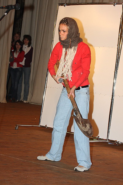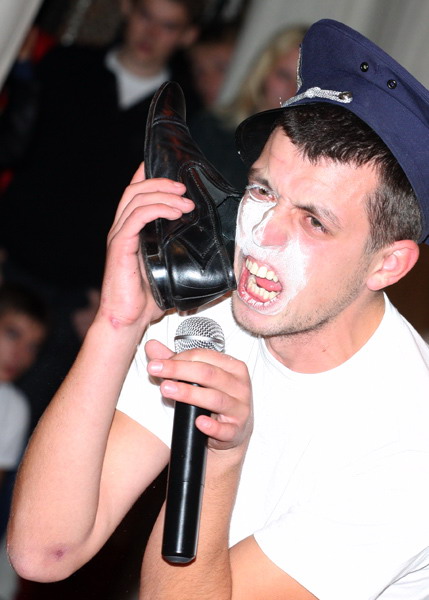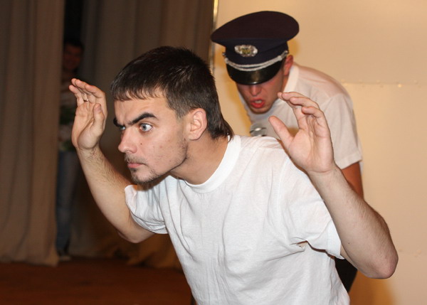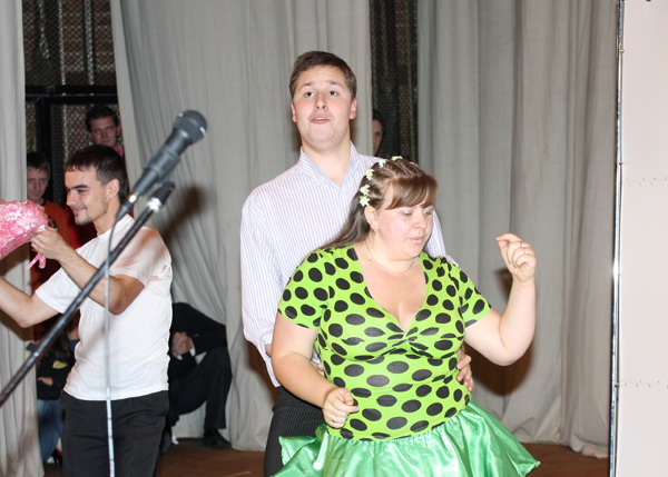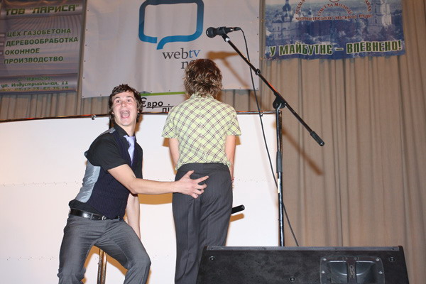 Конкурс открывали опытные "С потолка". Им пришлось нелегко, ведь нужно было "раскачивать" зал после такого долгого перерыва, но в общем целом с задачей они справились. Уже в первой визитке прозвучала шутка про музыкальный фонтан, который не давал покоя многим командам, как оказалось в последствии. Второй была, пожалуй, самая слабая из семи команд - "Шок". Ничего экстраординарного ребята не показали, что и отразилось на оценках. А вот команде "Все свободны" зритель подарил много своих апплодисментов. Интересное решение нескольких номеров и рэп про картошкокопателей, видимо, сделали свое дело. Продолжила смешной настрой и "Экстремальная тяга", всегда радующая интересными миниматюрами и хорошей актерской игрой. "Студкафе", выступавшие следующими, вроде как и не очень заходили на зал, но заключительная миниатюра с туалетной бумагой и прочими принадлежностями "вытянула" их к хорошим оценкам. Участники команды "Все включено" очень уж превысили временной лимит, и это, наверное, сказалось на их оценках, хотя было довольно забавно. Завершала визитку "Интрига", хорошо повеселившая публику и жюри, потому и вышла в лидеры после первого конкурса.