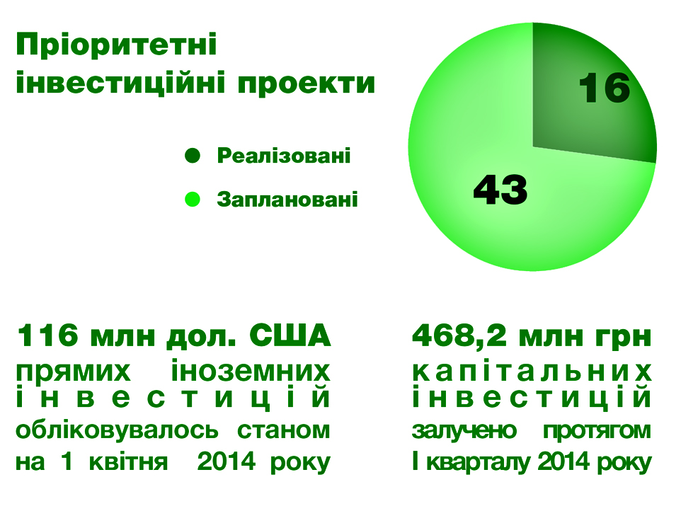 Согласно информации по инвестиционной деятельности за январь-март 2014 по данным главного управления статистики в Черниговской области в экономику области привлечено 468,2 млн. грн. капитальных инвестиций, что в сопоставимых ценах на 7,2% меньше объема капитальных инвестиций за соответствующий период 2013 г.