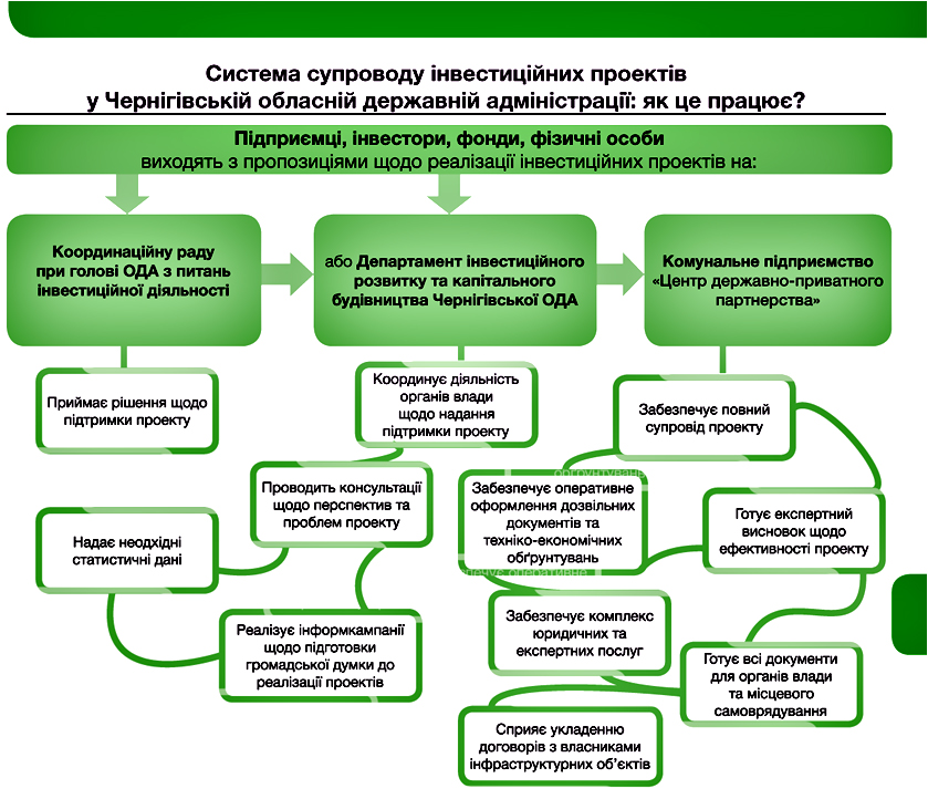 Так, в пояснительной записке к решению 20-й сессии Черниговского облсовета о переименовании КП «Будова» в КП «Центр государственно-частного партнерства» говорится, что созданная структура будет заниматься сопровождением инвестиционных проектов, включая проведение юридических, технико-экономических экспертных оценок инвестиционных проектов, оказание помощи в разработке и оформлении бизнес-планов и документации, получения необходимых согласований и разрешений. При этом услуги будут платными.