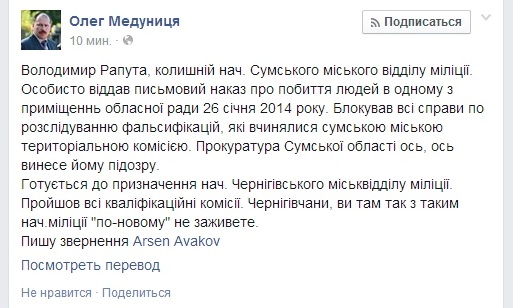 «Володимир Рапута, колишній начальник Сумського міського відділу міліції. Особисто віддав письмовий наказ про побиття людей в одному з приміщеннь обласної ради 26 січня 2014 року. Блокував всі справи по розслідуванню фальсифікацій, які вчинялися сумською міською територіальною комісією. Прокуратура Сумської області ось-ось винесе йому підозру. Готується до призначення начальником Чернігівського міськвідділу міліції. Пройшов всі кваліфікаційні комісії. Чернігівчани, ви там так з таким нач.міліції "по-новому" не заживете. Пишу звернення Arsen Avakov»