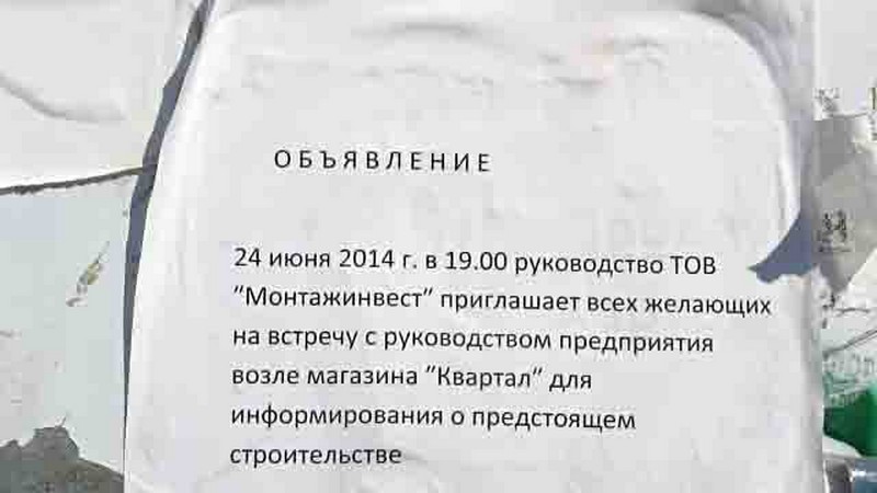Что же касается наименования фирмы-застройщика, то «добрые люди» указали нам на объявление, прилепленное на клочке бумаги к стене продуктового магазина. В объявлении (которое нормальный человек и читать-то не будет), было написано, что «24 июня ТОВ «Монтажинвест» приглашает всех желающих на встречу с руководством предприятия возле магазина «Квартал» для информации о предстоящем строительстве». Вот как раз этот «Монтажинвест» и планировал произвести застройку квартала в районе ЗАЗа.