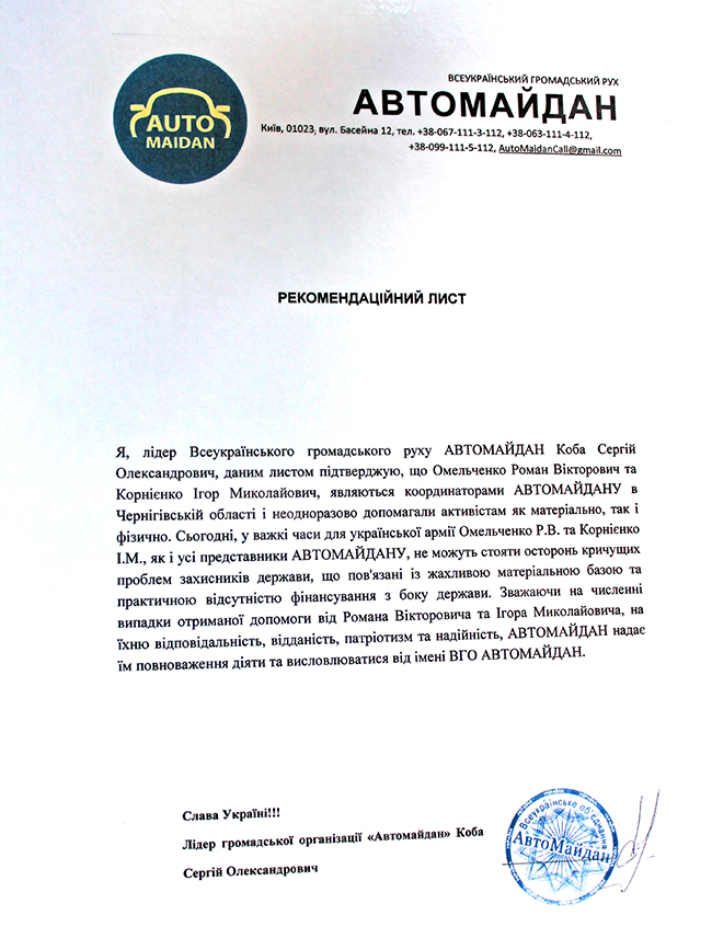 Роман Омельченко также показал Рекомендательное письмо от лидера Всеукраинского общественного движения Автомайдан Сергея Кобы, в котором говорится, что Роман Омельченко и Игорь Корниенко являются координаторами Автомайдана в Черниговской области.