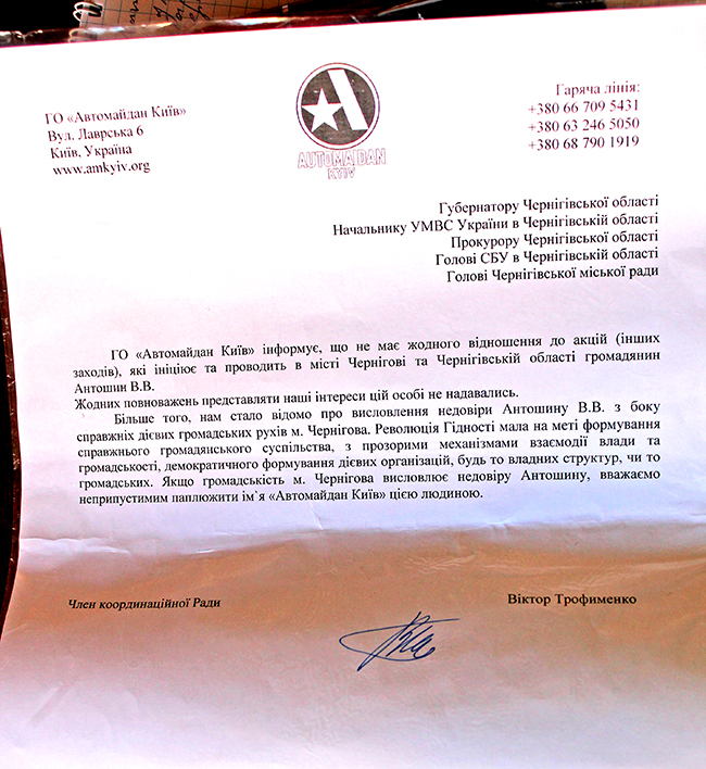 Информационное письмо от ВО «Автомайдан» в котором говорится, что Вадим Антошин не имеет никакого отношения к акциям, проводимым Автомайданом в Чернигове.