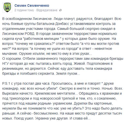 "В среду, 23 июля, во время штурма Лисичанска (ЛНР) погиб командир части нацгвардии №3011 Центрального оперативно-территориального объединения, полковник Александр Радиевский.