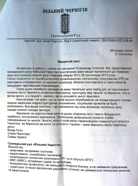 30 июля, под стенами черниговской мэрии, активисты движения «Вільний Чернігів» провели пикет, который проходил в рамках всеукраинской акции активистов Евромайданов под одним основным лозунгом «Ненаказанное зло растет!».