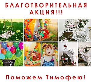 15 августа, в пятницу, с 17.00 до 20.00 в парке напротив "Мегацентра" каждый сможет пожертвовать посильную сумму на лечение Тимофея и получить красивые фотоснимки своих деток или семейное фото от трех профессиональных фотографов!