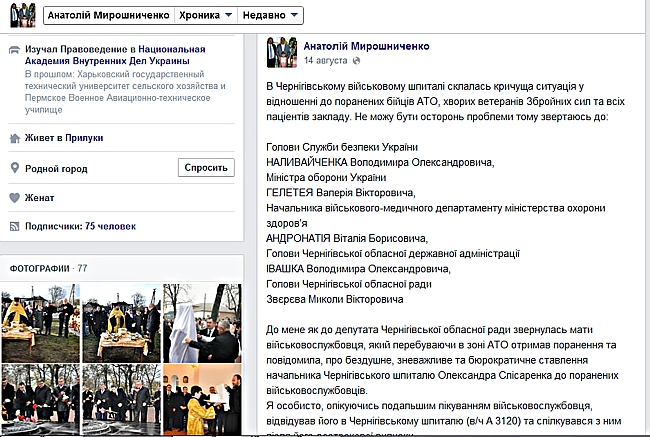 «До мене як до депутата Чернігівської обласної ради звернулась мати військовослужбовця, який перебуваючи в зоні АТО отримав поранення та повідомила, про бездушне, зневажливе та бюрократичне ставлення начальника Чернігівського шпиталю Олександра Слєсаренка до поранених військовослужбовців, – пишет в своем обращении Анатолий Мирошниченко. – Військовослужбовець, згідно рекомендацій свого ведучого лікаря, мав перебувати в шпиталі до 15.08.2014 року, але 12.08.2014 року близько 11:00 його та ще одного військовослужбовця виписали із шпиталю без відома ведучого лікаря за наказом О. Слєсаренка за те, що нібито в хлопців руки тхнули димом. Поранених бійців з речами виставили з шпиталю незважаючи, що в одного були не зняті післяопераційні шви, а у іншого в тілі знаходиться не видалений осколок. Пораненим навіть не надали транспорту для проїзду до Гончарівська для отримання у мед. частині відпускного листа на звільнення додому. Військовослужбовці змушені були за власні кошти найняти приватний транспорт для проїзду до військової частини».