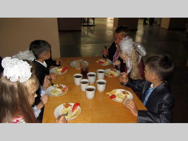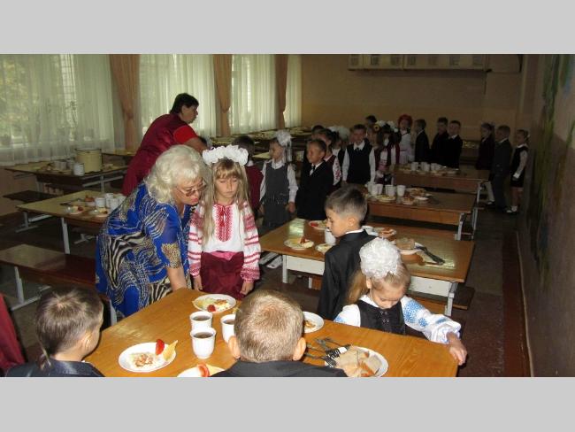 Первым уроком в лицее был урок «Україна – єдина країна!» Но, это, наверное, у старшеклассников. Первоклассники же долго усаживались за партами, прощались с родителями, а потом отправились на свой первый завтрак в стенах родного лицея. Мы тоже посмотрели, чем кормят учеников в школьной столовой.