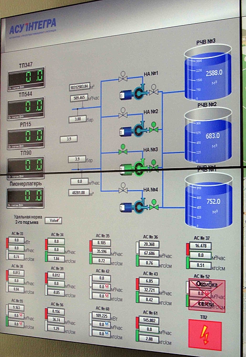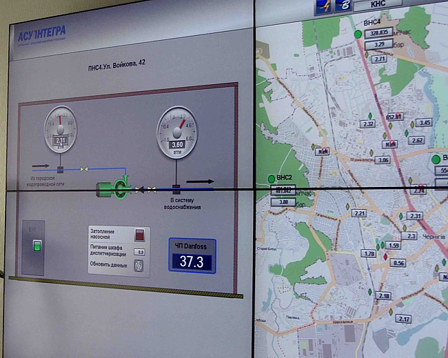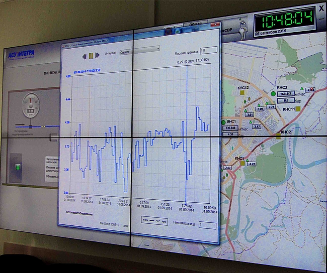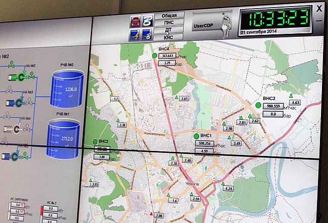 Начальник диспетчерской службы КП «Черниговводоканал» Николай Якименко включил большой настенный экран (который дублирует информацию на одном из мониторов диспетчера) чтобы продемонстрировать нам работу системы SCADA, которая несколько лет, как успешно внедрена на предприятии.