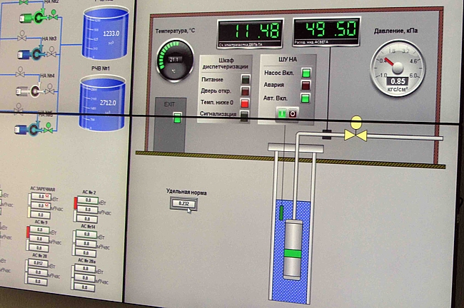 – Сейчас мы видим ситуацию на первой насосной станции, которая находится в Яловщине, – комментирует картинки на мониторе Николай Якименко. – На экране отображается уровень воды в первом и втором резервуарах. В настоящее время на подачу воды работает один насос. Реальная подача воды – 590 м3, давление 4,6 атм, питание поступает со второго ввода – 276 В. При необходимости на экране можно отобразить структуру работы каждой скважины. Красным цветом на схеме отображаются выключенные скважины. Зеленым – включенные скважины. Вся информация отображается в режиме реального времени. Мало того, диспетчер, через компьютерную сеть, может управлять работой скважин по всему городу прямо из этой комнаты. Вообще-то система работает в полностью автоматическом режиме. Но на каждой насосной станции также следит дежурный, который следит за работой системы.