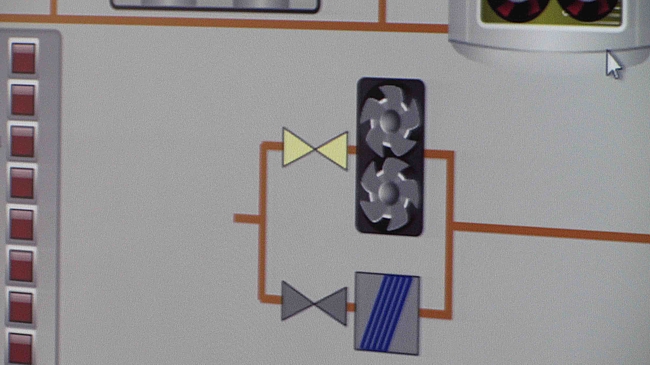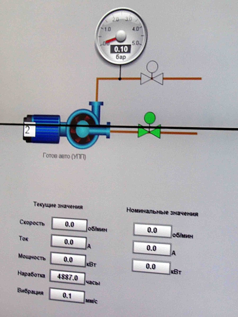 Аналогичным образом отслеживается и работа канализационных насосных станций (КНС). На схеме диспетчер видит уровень стоков в резервуаре и может контролировать работу насосов. Первый насос – самый большой, он отключен, поскольку пока нет такого количества стоков, чтобы задействовать его в работе. Синим цветом обозначены насосы, которые готовы к работе. И зеленым – насос, который работает в данный момент времени. Все насосы включаются полностью автоматически при возникновении такой необходимости. Если вдруг в работе насоса возникнет какая-то неисправность, на экране он сразу будет окрашен в красный цвет. Нам пояснили, что система SCADA позволяет посмотреть работу каждого агрегата, оценить потребляемый ток, мощность, наработку и давление на выходе.