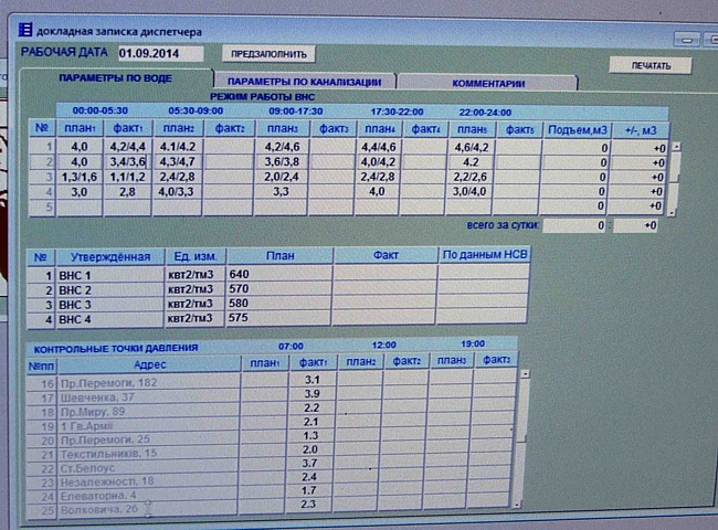 Как правило, в дневное время в диспетчерской КП «Черниговводоканал» дежурит три человека. Один из диспетчеров приходит в 7 часов утра. Он дежурит до 15-16 часов, в зависимости от количества поступающих звонков. Второй диспетчер приходит к 7 часам утра и дежурит до 19-20 часов. Это – основной диспетчер. Третий диспетчер приходит в 19 часов и дежурит всю ночь до 7 часов утра. Он дежурит один. Кроме этого, ежедневно с 8 утра до 17 часов с перерывом на обед дежурит диспетчер по качеству, она же – старший диспетчер. Также в течение всего рабочего дня работает начальник диспетчерской службы КП «Черниговводоканал».
