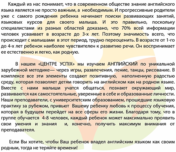 Английский язык в Центре Успех начинаем изучать с детьми от 1 года. На английском языке в группах до 4-х человек проводятся уроки раннего развития, при этом используется специально разработанная зарубежная методика. Многие специалисты считают, что чем раньше вы начнете обучать детей английскому, тем лучше.