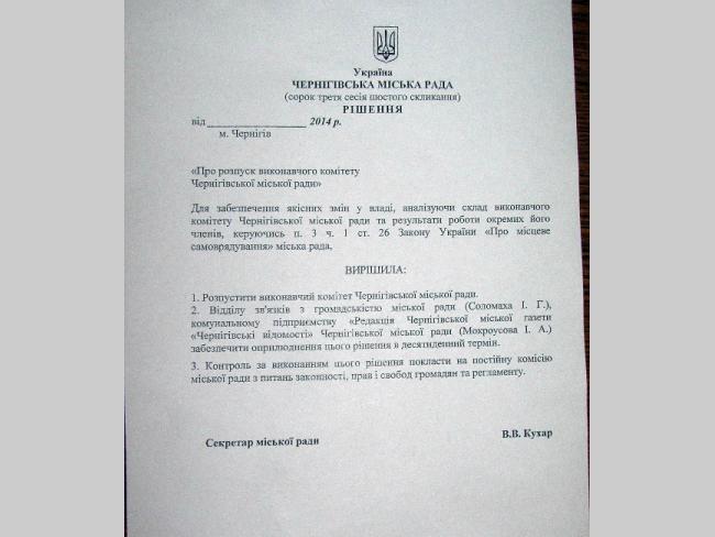В ходе сессии вопрос «О роспуске исполкома городского совета» был рассмотрен первым (хотя должен был рассматриваться в порядке очередности, поскольку решение о первоочередности не принималось) и проголосован «за». По такому важному для Чернигова вопросу не было ни выступающих, ни отчета исполкома. И все произошедшее напоминало, скорее всего, политическую расправу над неугодными чиновниками.