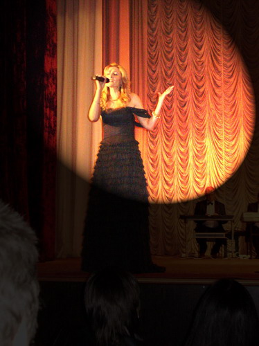 Окончательно заводит зал Елена Кантер. Мягкий вокал, особенный лиризм, оригинальное звучание, индивидуальность, все это предлагает Елена Кантер слушателю. Ее красоту, обаяние, стильность и талант по достоинству оценили зрители. Букеты цветов — благодарность за ее талант.