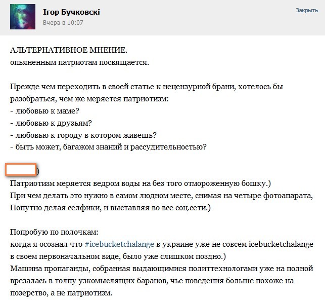 Сам Игорь на своей страничке в Контакте называет свой «крик души» альтернативным мнением, что составляет 325 слов из возмущений и оскорблений. Игорь считает, что участвуют в таком флешмобе те, кому страшно идти воевать. Самому ему при этом близка сфера развлекательной индустрии, и судя по всему, на войну парень не рвется, но искреннее осуждает других людей.