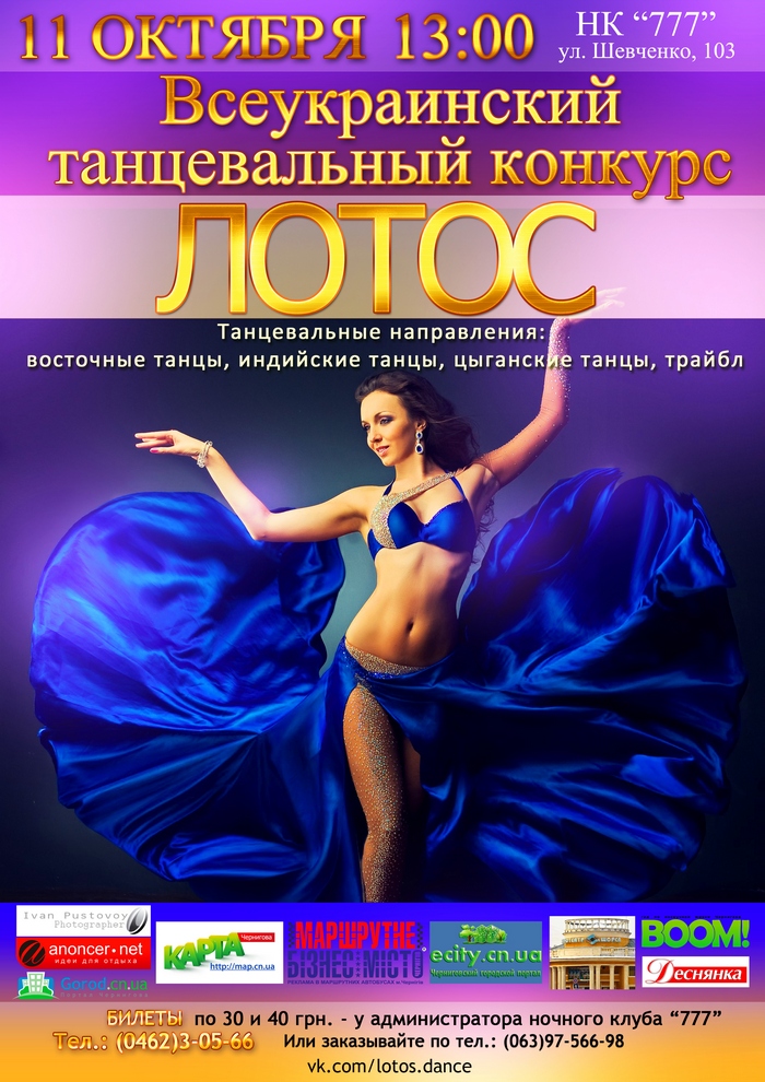 11 октября, в 13.00 в ночном клубе "777", по ул. ул. Шевченко, 103, на самом большом танцполе Чернигова, состоится долгожданный Всеукраинский танцевальный конкурс "Лотос"!