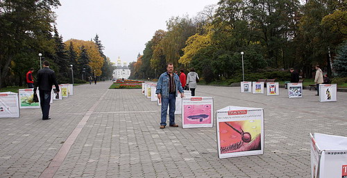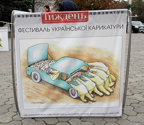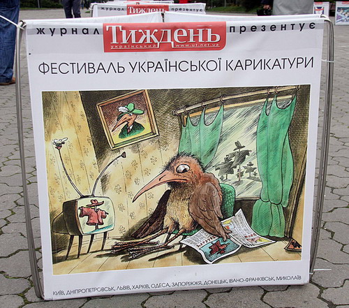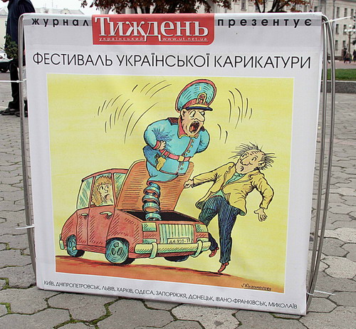 Передвижная выставка карикатур не боится ни тумана, ни дождя. Все работы напечатаны на виниле. На выставке представлены карикатуры лучших художников-карикатуристов Украины. Среди них Владимир Казаневский, Юрий Кособукин и Виктор Кудин. Познакомить каждого украинца с современной карикатурой - главная цель фестиваля, отмечают его организаторы.