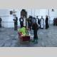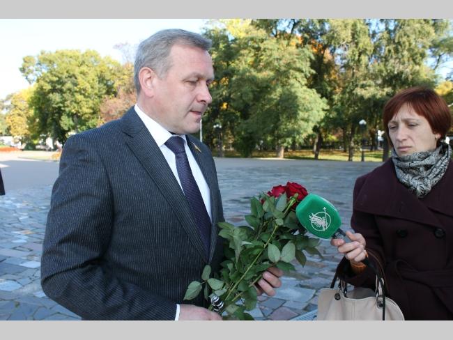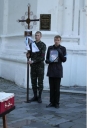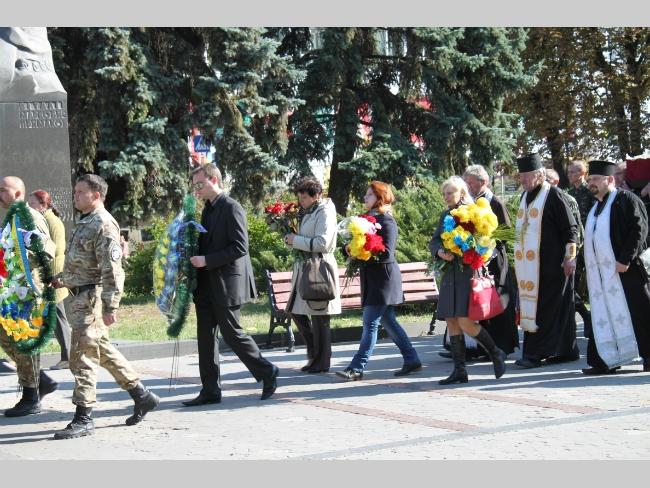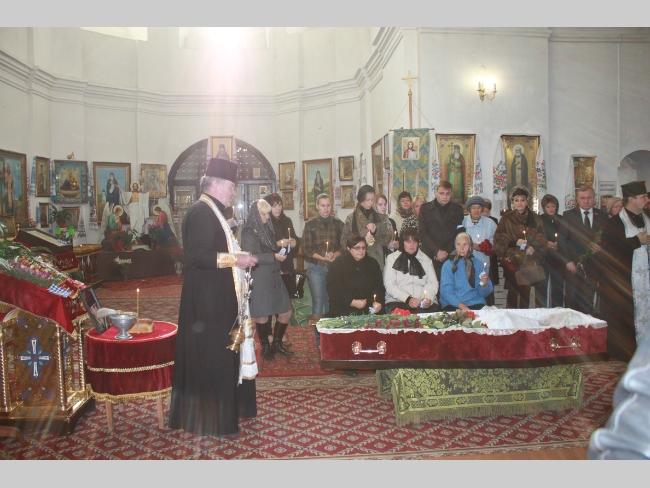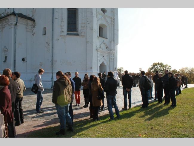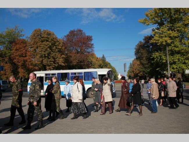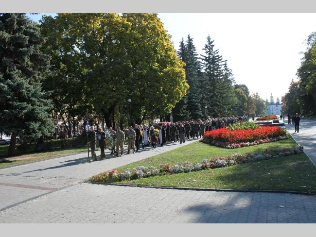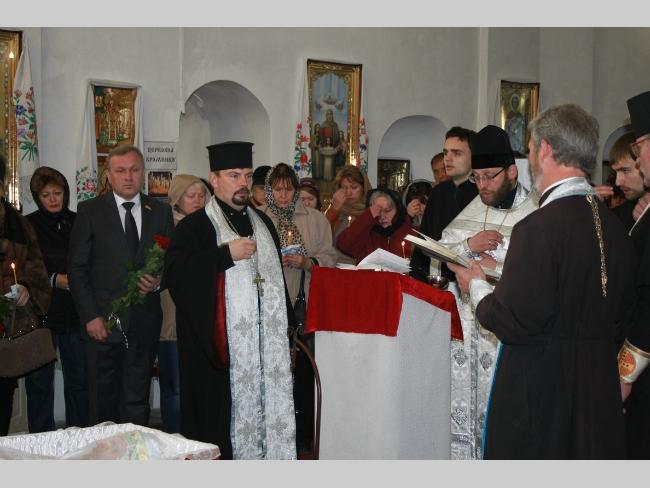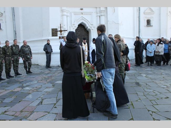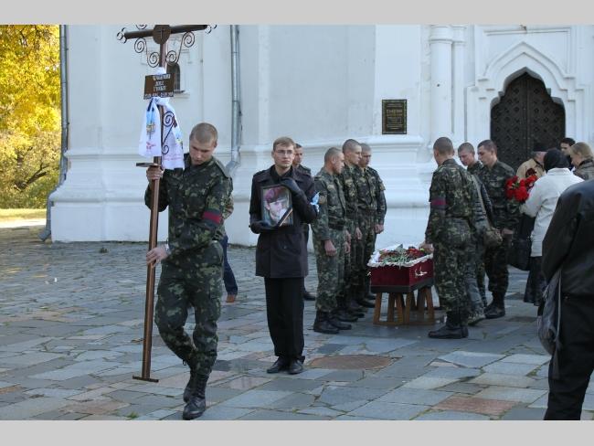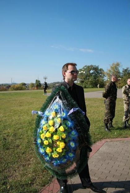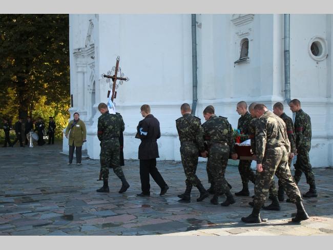 И вот гроб с телом героя грузят в автобус, траурная процессия двигается к следующей точке назначения — к Екатерининской церкви, где будут отпевать усопшего. По дороге вижу, как в направлении к церкви идет много людей с живыми цветами в руках, на зданиях приспущены флаги, на них черные ленты — сегодня в городе траур: так Чернигов оказывает последние почести своему герою. К Екатериненке подходит глава Черниговского облсовета Николай Зверев с пышным букетом алых роз: «Земля пухом цій людині, цей хлопець — герой»...