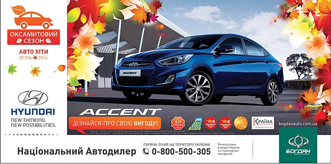 Бесспорными преимуществами Hyundai Accent является его неординарный дизайн, практичность, конкурентная цена и дополнительные бонусы, которые действуют в период проведения проекта «Бархатный сезон» в дилерских центрах сети Национального Автодилера «Богдан-Авто Холдинг», а именно: