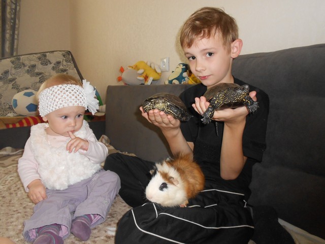 Макс и Анюта с черепахами по кличке Чери и Шустрик и морской свинкой Борей