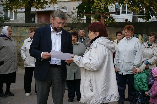 Не встигли й оформити своє колективне звернення, як кандидат особисто навідався до них у гості саме на свято Покрови. Анатолію Долеско цей мікрорайон знайомий, адже тут живе його бабуся. Поспілкуватися з кандидатом прийшло чимало бажаючих. Люди просять поставити бордюр, аби стічні води не переливалися на дитячий майданчик. А от молоді мами ще й за те, щоб їм допомогли з облаштуванням ігрової зони для дітей: обгородили парканом і насипали пісочницю.