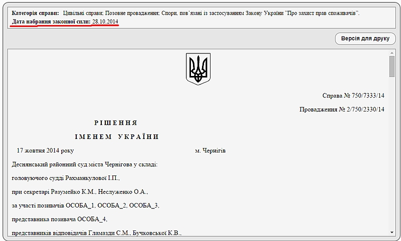 29 октября 2014 года мы попросили начальника КП «Деснянское» Игоря Шаповалова прокомментировать судебное решение о ремонте прибора учета. На что начальник КП «Деснянское» заявил, что судебного решения еще нет, и он его прокомментирует после того, как оно вступит в законную силу. Согласно решению суда, апелляция могла быть подана в течение 10 дней с момента оглашения решения (17 октября 2014 года). И юрист КП «Деснянское» о том, что срок ее подачи истек, должен был проинформировать своего начальника. По информации из Единого реестра судебных решений, решение суда по иску граждан с ул. Героев Чернобыля вступило в законную силу 28 октября 2014 года. Получается, что руководитель предприятия об этом даже и не знал?