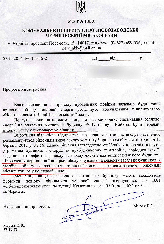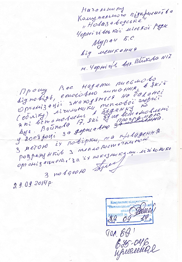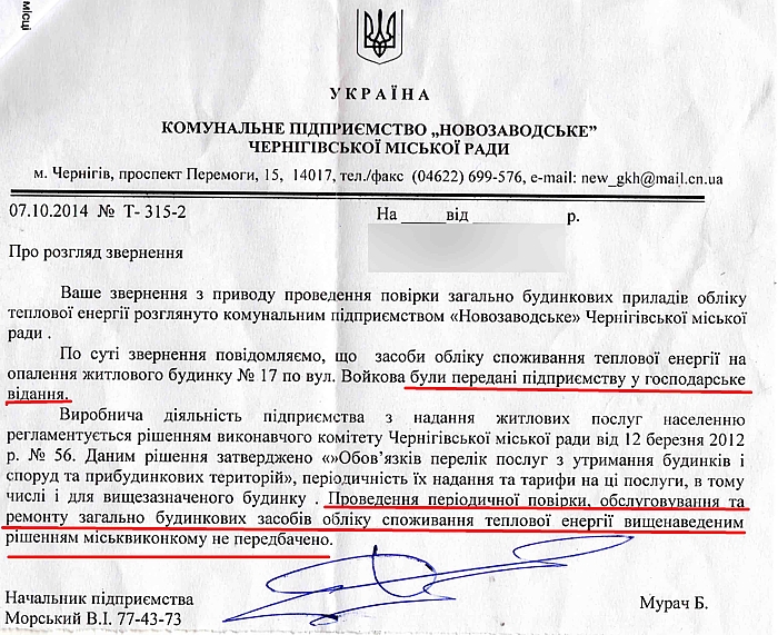 Пока, насколько нам известно, еще ни один дом не перевели на оплату по нормативу. Но у людей есть другая проблема – неисправные приборы учета тепла. В одном из домов по ул. Героев Чернобыля, который находится на балансе КП «Деснянское», прибор учета тепла вышел из строя. Жильцы дома обратились в КП «Деснянское» с просьбой отремонтировать прибор, с целью обеспечения расчетов по нему в отопительный период. КП «Деснянское» отказалось выполнять законное требование жильцов и «адміністрацією дільниці з обслуговування житлового фонду №1 КП «Деснянське» 02.06.2014 року роз'яснено заявникам, що підприємство не може провести ремонт лічильника за власний рахунок, незважаючи на те, що він знаходиться у нього на балансі, оскільки рішенням №56 Чернігівської міської ради від 12.03.2012 року «Про послуги з утримання будинків і споруд та прибудинкових територій» не передбачено виконання повірки та ремонту загальнобудинкових приладів обліку ГВП та опалення».