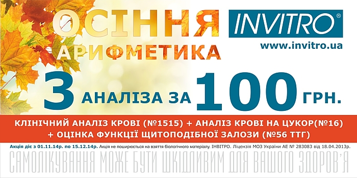 Более подробно об акции вы сможете узнать по телефону 0-800-50-90-90, а также на сайте ИНВИТРО www.invitro.ua. Стоимость взятия биологического материала под акцию не попадает.