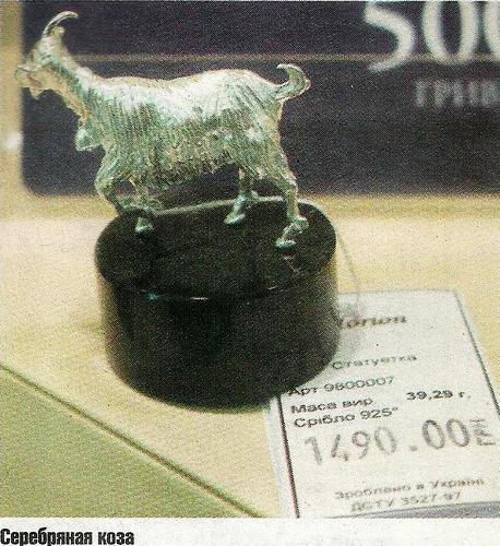 В «КЮЗе» к Новому году приготовили... козу. Точнее, серебряную статуэтку животного — символа будущего года.. Цена —- 1490 гривен. Продавец рассказала, что раньше ажиотаж начинался после Дня Святого Николая. В прошлом году — примерно с 27 декабря. Чего ждать в этом году — теряются в догадках.